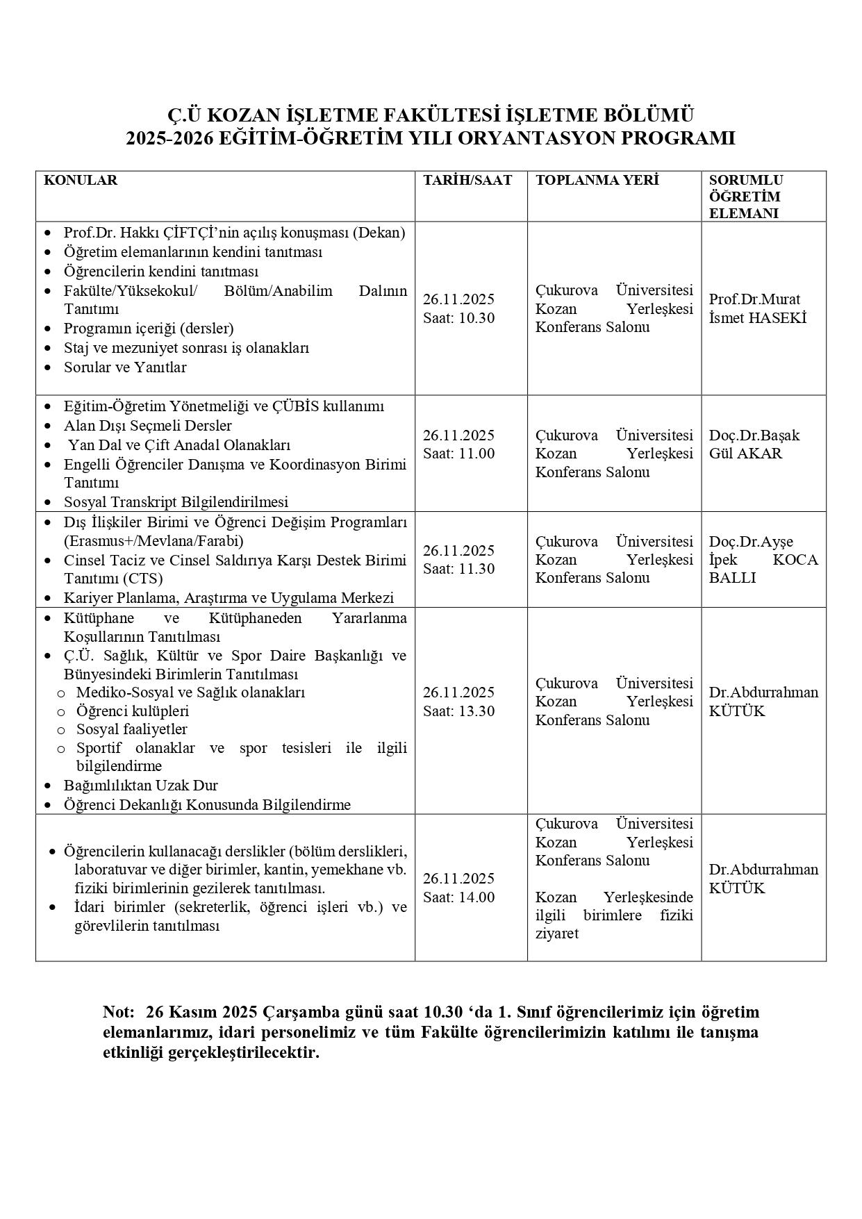 Ç.Ü. KOZAN İŞLETME FAKÜLTESİ İŞLETME BÖLÜMÜ 2025-2026 GÜZ YARIYILI DERS PROGRAMI