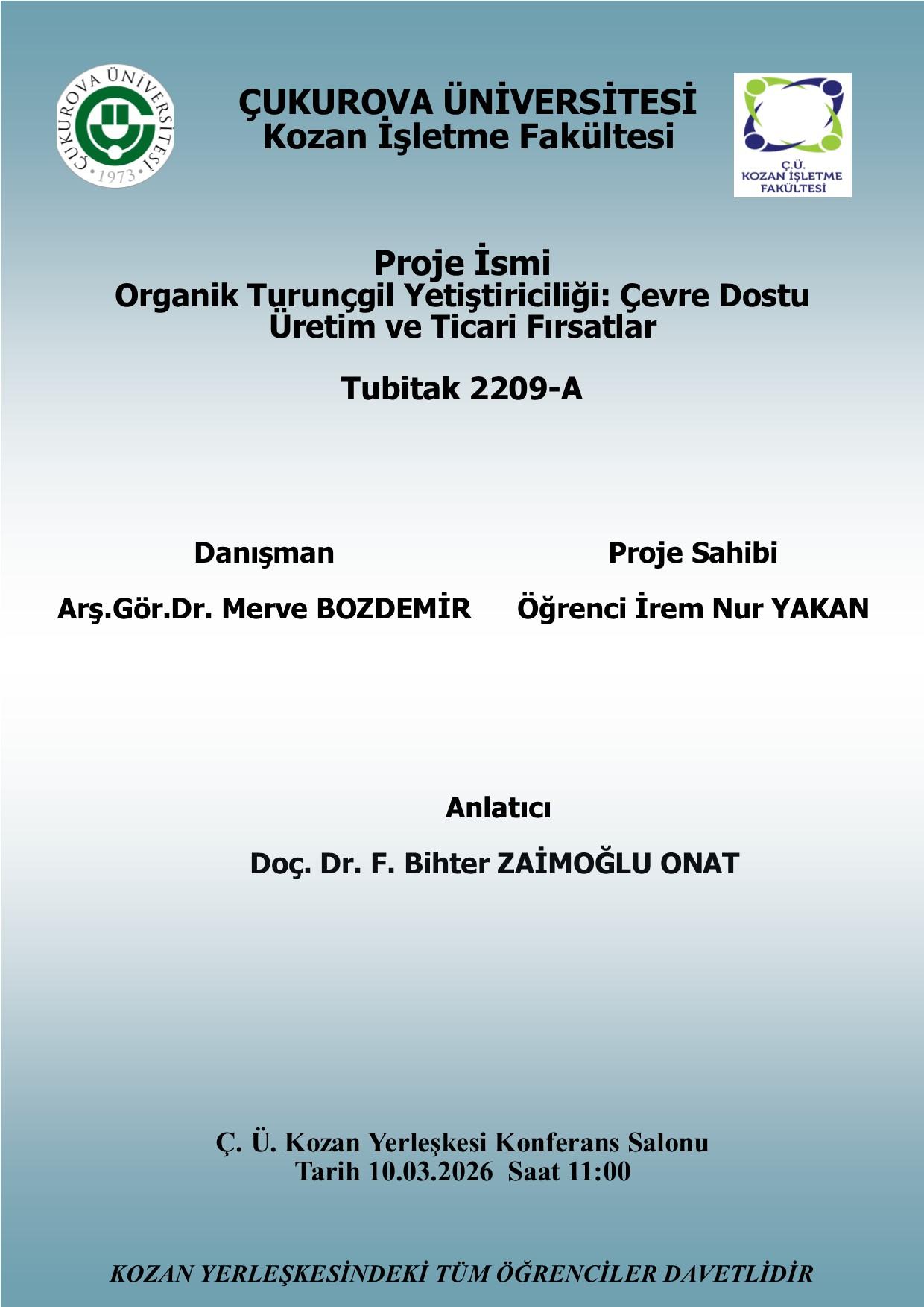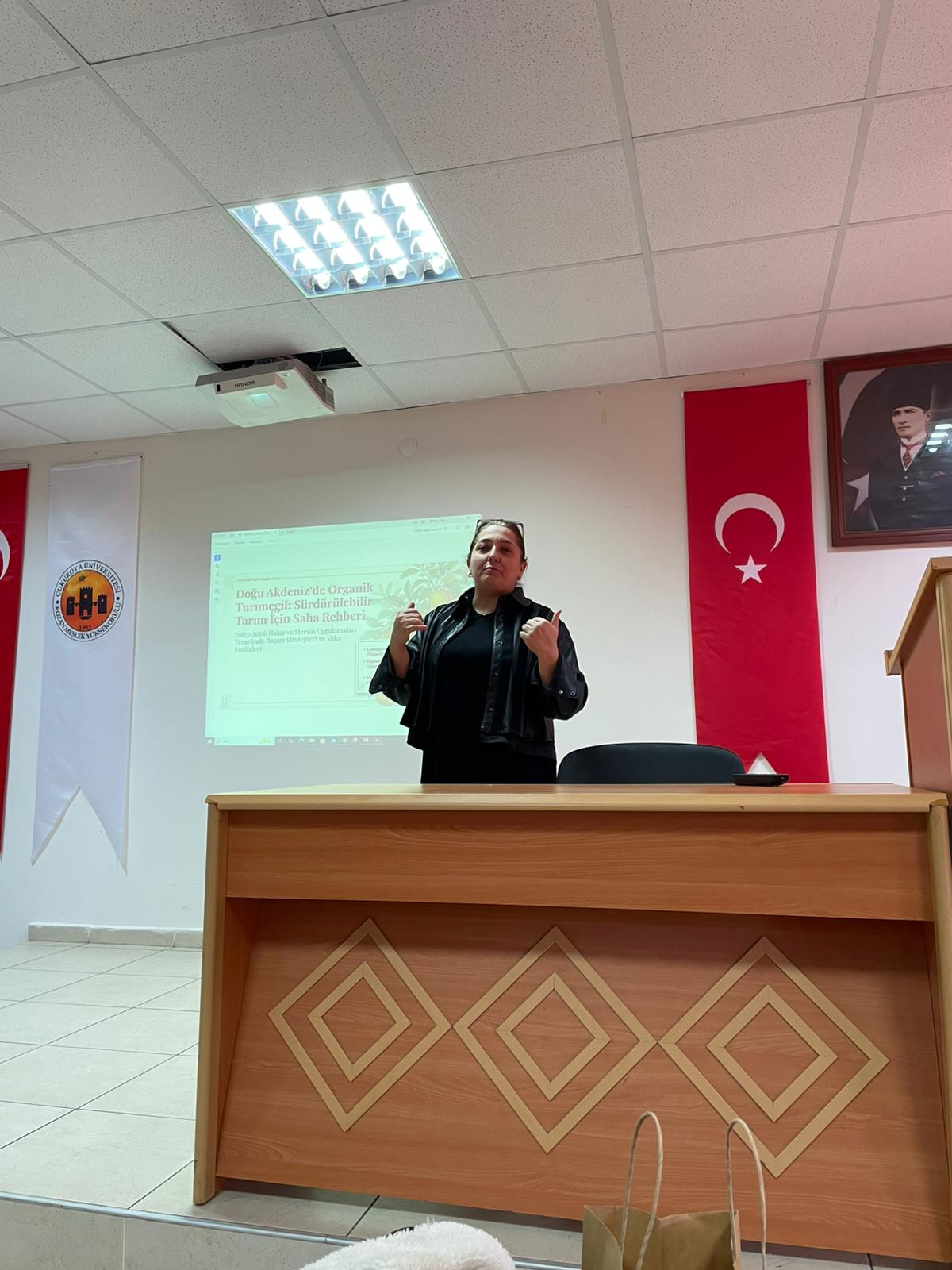 Fakültemiz İşletme Bölümü öğrencisi İrem Nur Yakan’ın “Organik Turunçgil Yetiştiriciliği: Çevre Dostu Üretim ve Ticari Fırsatlar” başlıklı TÜBİTAK projesi kapsamında Doç. Dr. Bihter Zaimoğlu Onat tarafından bir eğitim semineri verilmiştir. Seminerde organik yetiştiricilik yöntemleri, temel ilkeler, hastalık ve zararlılarla biyolojik mücadele, sertifikasyon süreci ve organik turunçgil üretiminin sürdürülebilir tarım ile üreticiye sağladığı ekonomik avantajlar ele alınarak bilgilendirme ve farkındalık oluşturma amaçlanmıştır. Değerli katkılarından dolayı hocamıza ve katılım sağlayan herkese teşekkür ederiz.